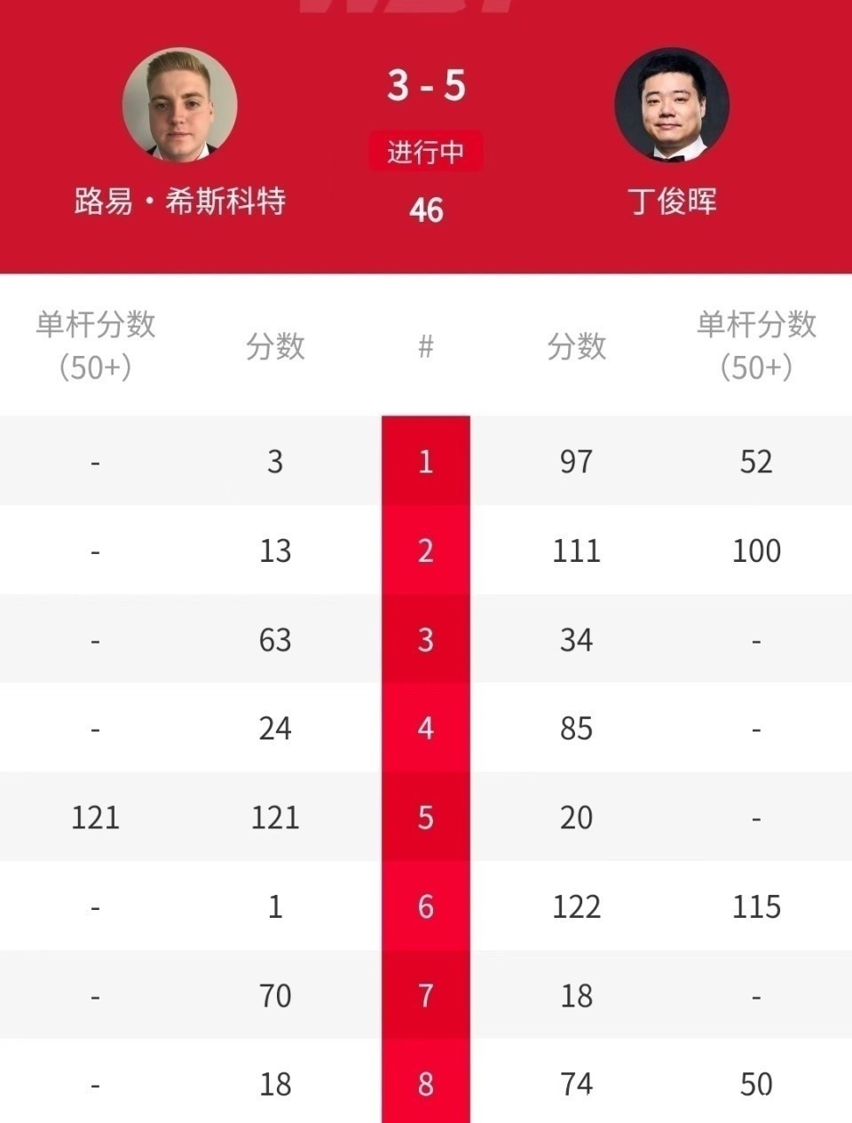 绝境下,莱恩斯在第七局和第八局贯穿补救两个赛点,比分追成4-4。决胜局,莱恩斯单杆58分锁定胜局,5-4逆转淘汰埃利奥特。第四轮,莱恩斯挑战寰宇名循序八的丁俊晖。这场比赛,丁俊晖实力彰着占优,第一局一上来就以1-0强势开局。