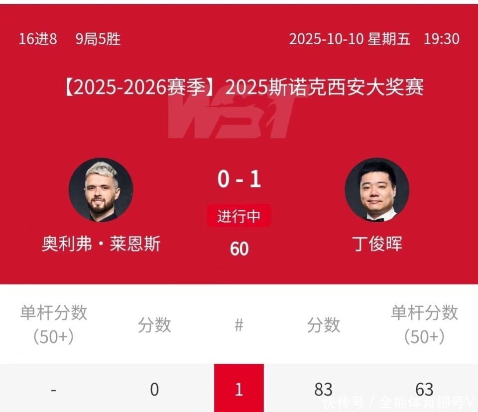 83-0开局,1-0冲冠,丁俊晖力压小莱恩斯,中国一哥景况火爆